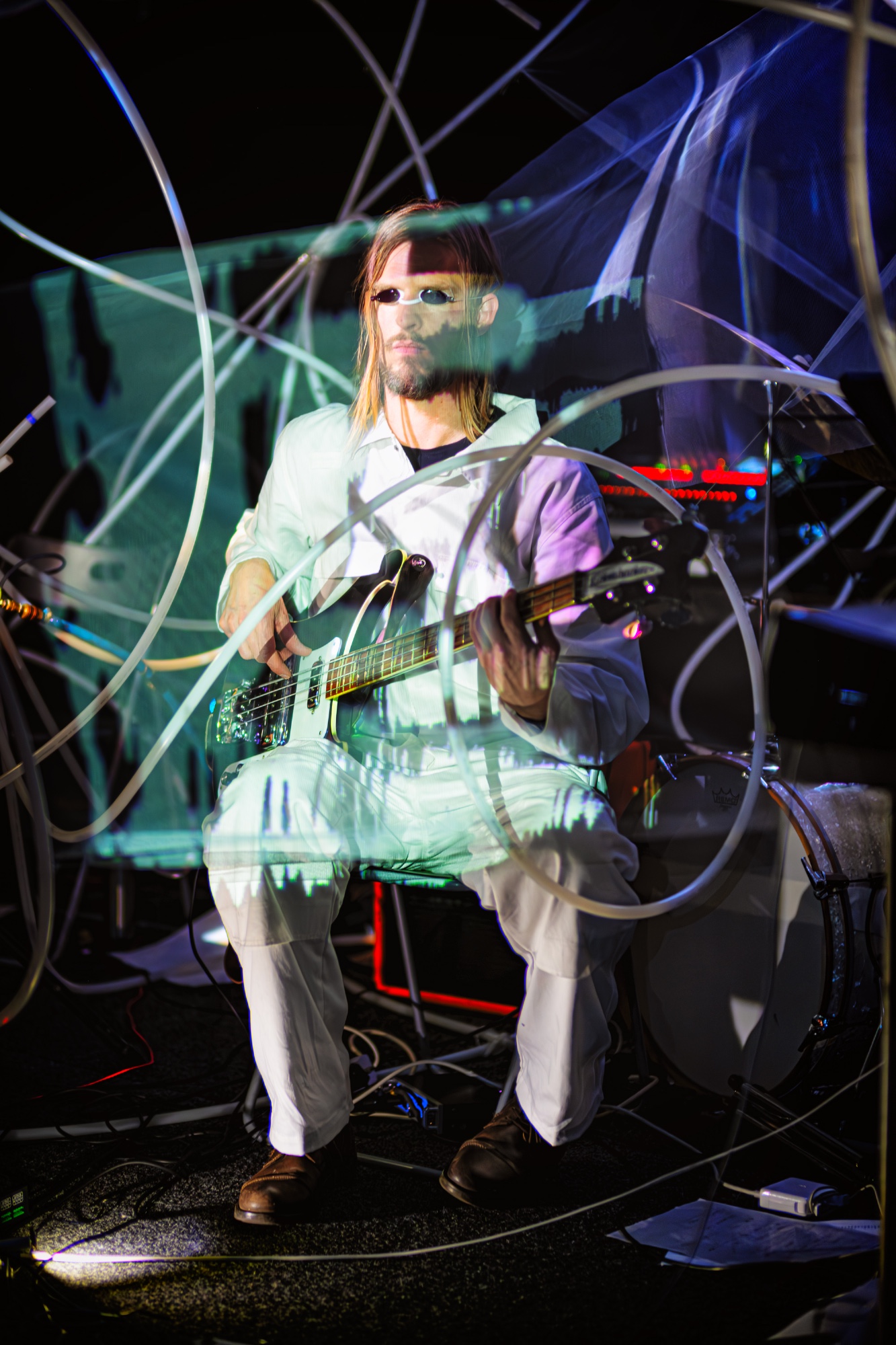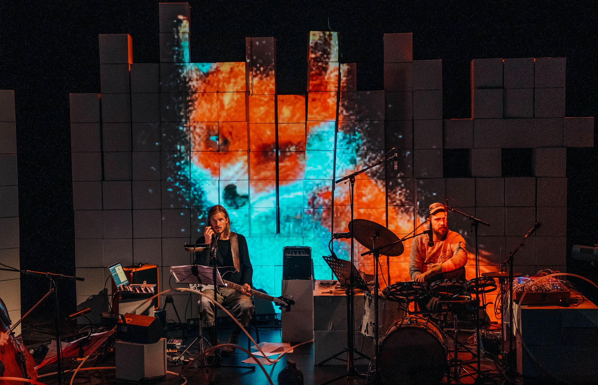 Geïnspireerd door wetenschappers van Rijksmuseum Boerhaave componeerden ze een muzikale theatertrip waaraan je je helemaal overgeeft; waarin je je het ene moment verplaatst in het perspectief van vleermuizen en walvissen, dan weer een aanhanger van de reptielen-complottheorie hoort zingen, gevolgd door een onnavolgbare spoken-word over hoe iets tegelijk 0 én 1 kan zijn. Dit alles in een levende video-installatie (Noemi Biro en Pleun Gremmen) waarin deep fakes samenvloeien met door de ruimte afgeschoten elementaire deeltjes.